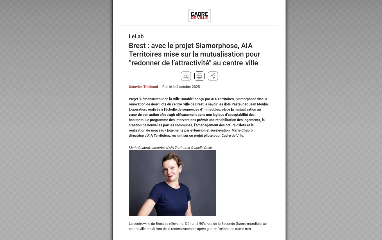 Cadre de Ville publie l’article «Brest : avec le projet Siamorphose, AIA Territoires mise sur la mutualisation pour “redonner de l’attractivité » au centre-ville»