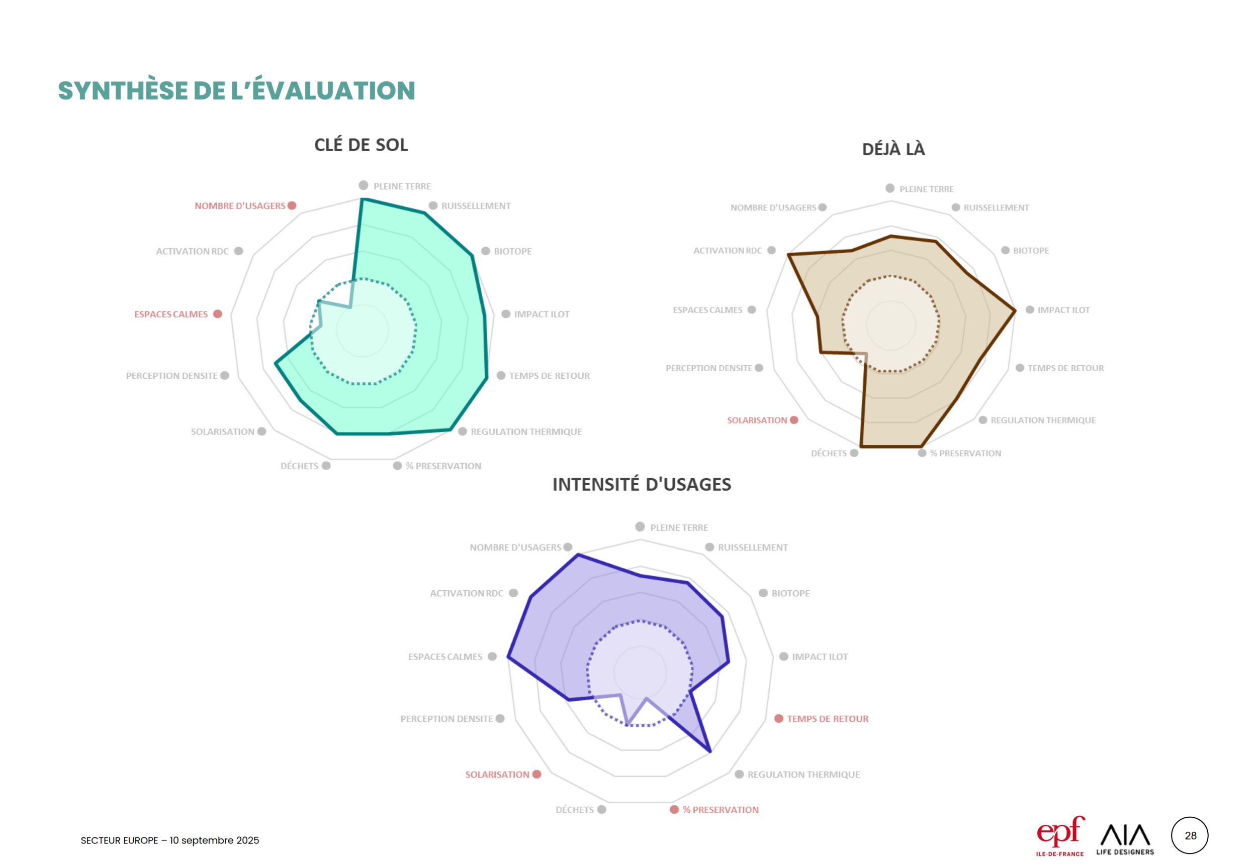 La mission se déroule en 3 phases. La première consiste en un état des lieux urbain et bâtimentaire construit sur la méthodologie d’évaluation environnementale ABCD de l’EPFIF, complétée par un indicateur d’intensité urbaine. Les indicateurs ciblent la désartificialisation des sols et la biodiversité, l’impact carbone de l’opération et des futurs bâtis, et le confort climatique et d’usage.