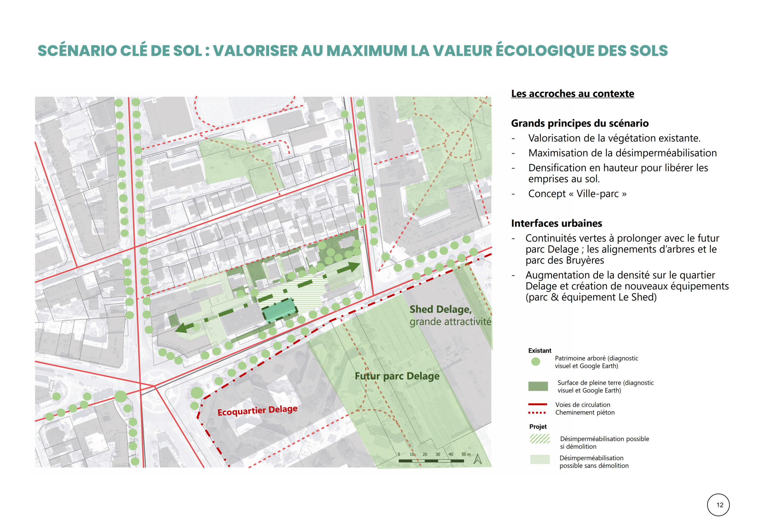 La phase 2 consiste à développer des scénarios contrastés privilégiant soit le SOL, – désimperméabilisation et végétalisation maximales impliquant la surélévation du bâti – soit le déjà-LA, – valorisation du bâti existant et extension horizontale – soit l’intenSIté urbaine : scénario plus classique créant un front urbain dense avec l’activation d’usage au RDC et un cœur d’ilot dégagé.