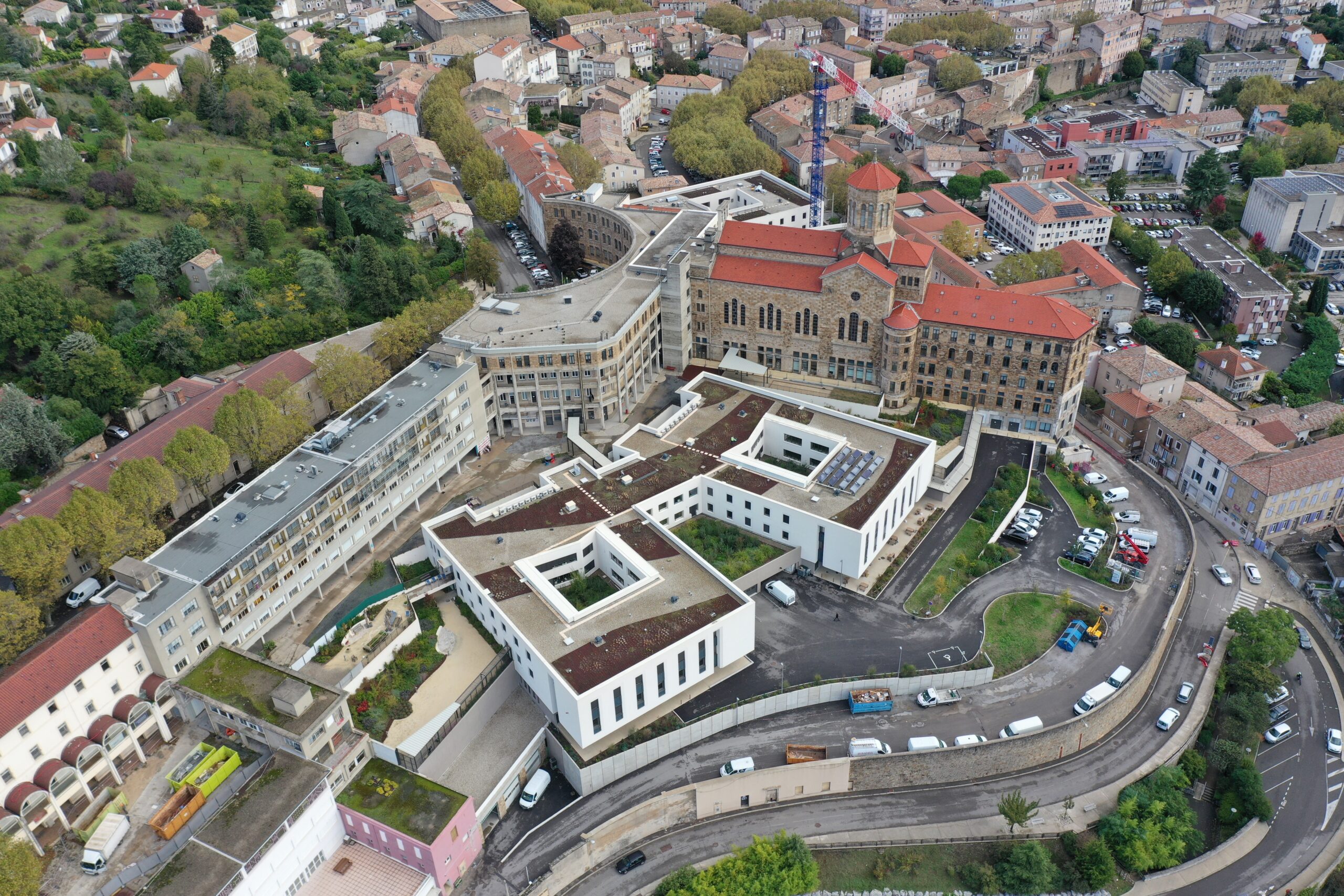 Cette opération de 40 millions d’euros de travaux pour 31 000 m² de SDP offrira une seconde vie à l’hôpital psychiatrique installé à Privas depuis le XIXème siècle. La qualité d’écoute et l’investissement de chacun des membres du groupement nous a permis de questionner jusqu’au bout le programme afin de trouver la meilleure réponse aux besoins de l’hôpital. Le projet retenu tire parti de l’histoire et des qualités morphologiques du site. La composition architecturale et paysagère a été pensée autour des jardins généreux. Le concept paysager est porté par les lignes de force du terrain naturel, reflet de la richesse du patrimoine géologique du site.