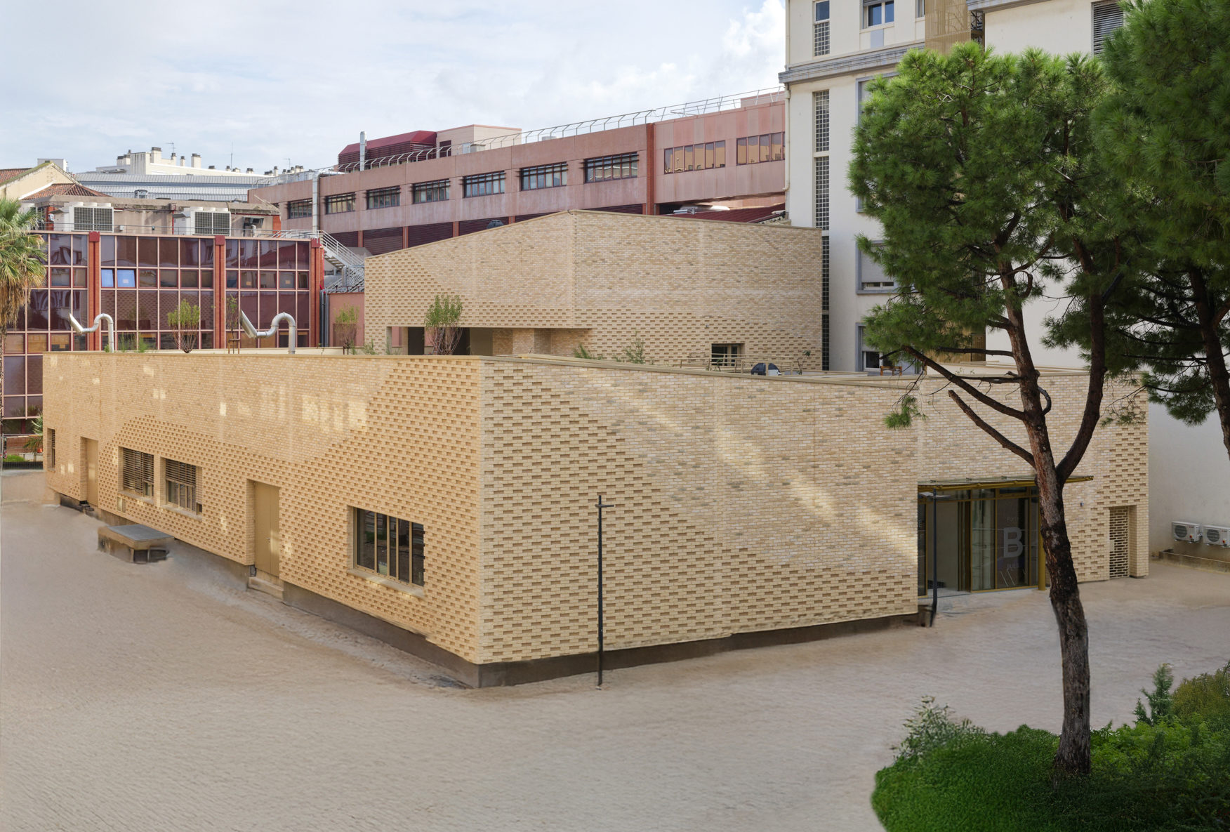 Dans ce contexte, les bâtiments ont été implantés pour s’accrocher au terrain et aux bâtiments avoisinants, avec une volumétrie générant un effet de douceur de l’ensemble. Les terrasses végétalisées ou accessibles, outre leur rôle climatique nécessaire, apportent une richesse au site et offrent des cinquièmes façades soignées et vivantes aux regards des utilisateurs et visiteurs (les surfaces perdues au sol se retrouvent dans ces lieux généreux et protégés).